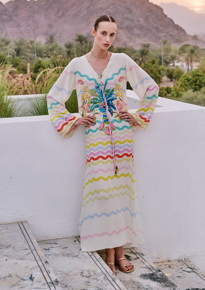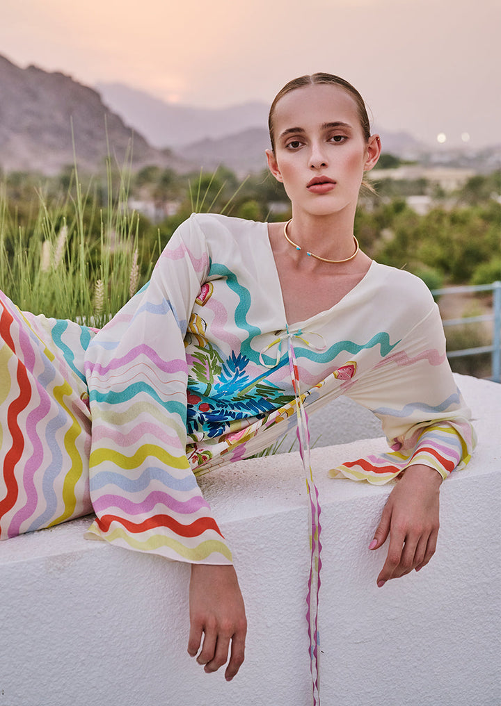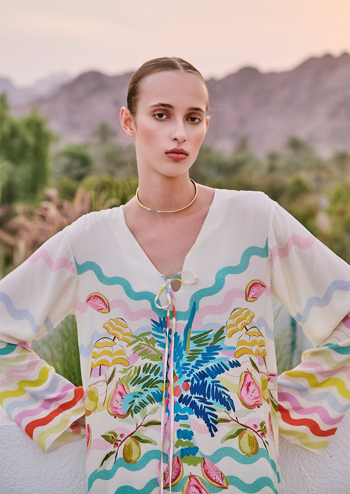 The Emma kaftan blends ivory crepe with ripple-stripe patterns and a tropical fruit and palm print in jade, azure, lemon, and pastel pink. A plunging neckline with bead tassels and wide sleeves completes this effortless resort piece.