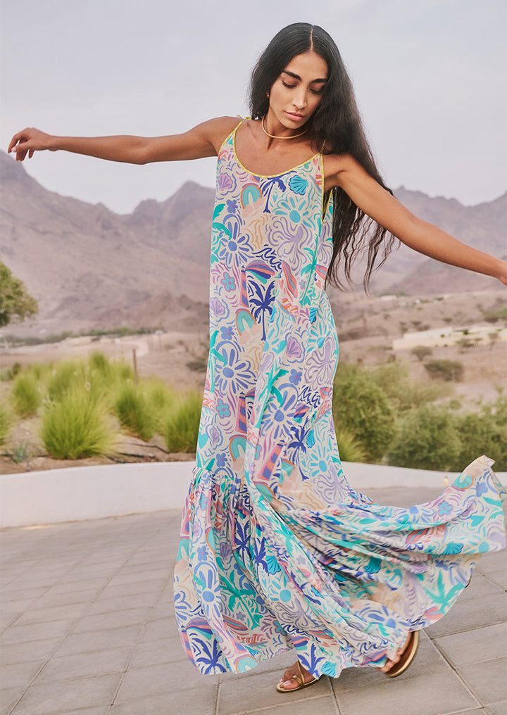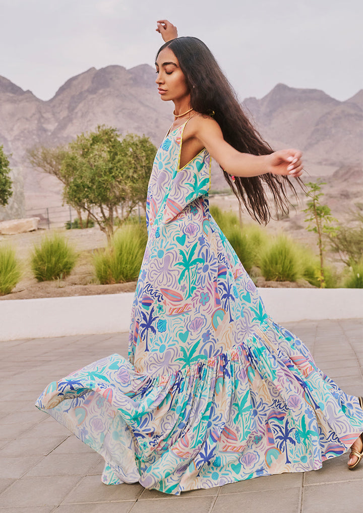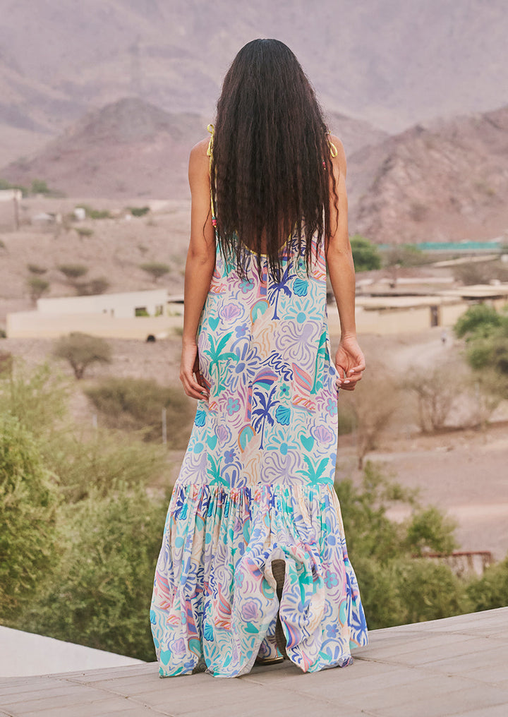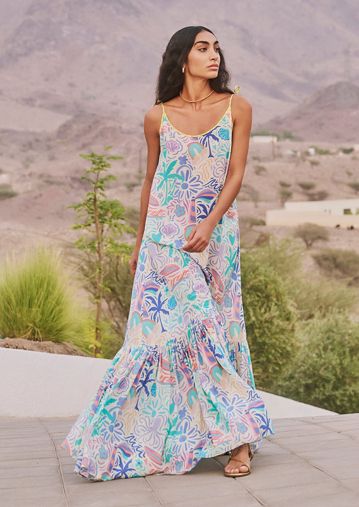 A vision of summer lightness, the Rosa dress features cascading tiers in a whisper-light crepe adorned with tropical motifs in lilac, seafoam, coral peach, and azure. Delicate lemon-yellow shoulder ties are finished with bead tassels, offering a playful artisanal finish.